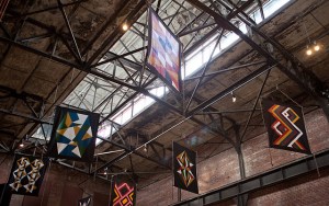 Culling from visual references to slavery, particularly the adoption of quilt patterns as communication tools in the Underground Railroad, Molly Dilworth’s paintings in 36°30′ display abstracted icons from modern companies and states who employ unethical labor practices. Indicating that slavery has not ended but has been simply transformed into new forms of outsourced labor, these paintings on military surplus blankets hang high from the ceiling like banners to emphasize the distance between consumers and the goods we collectively consume.